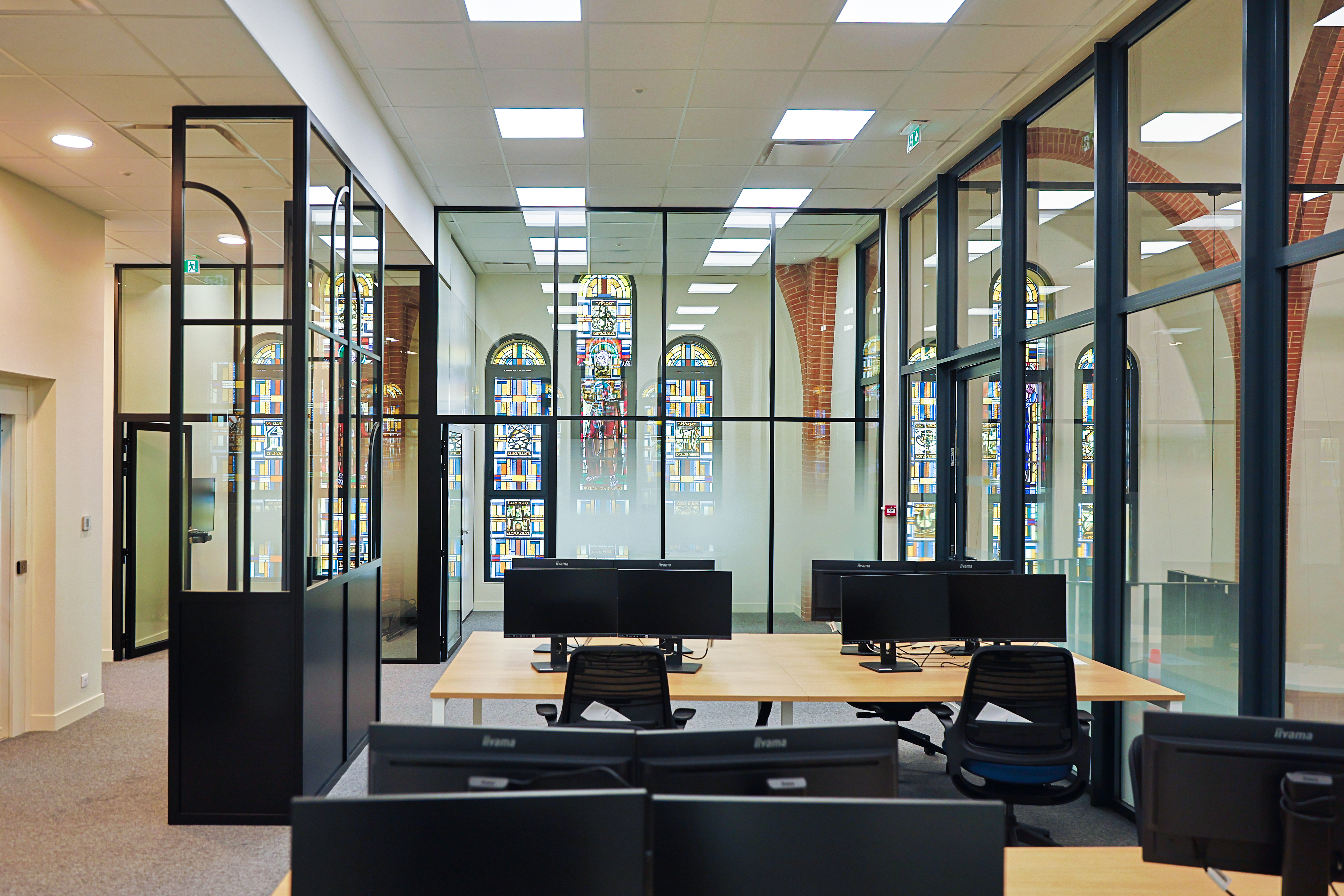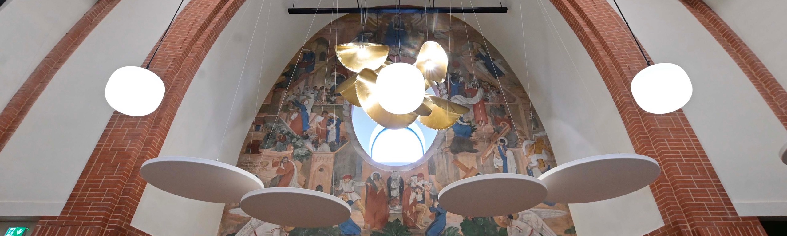 Les vitraux, la fresque centrale, les volumes d’origine et la voûte ont été intégralement préservés et sublimés.