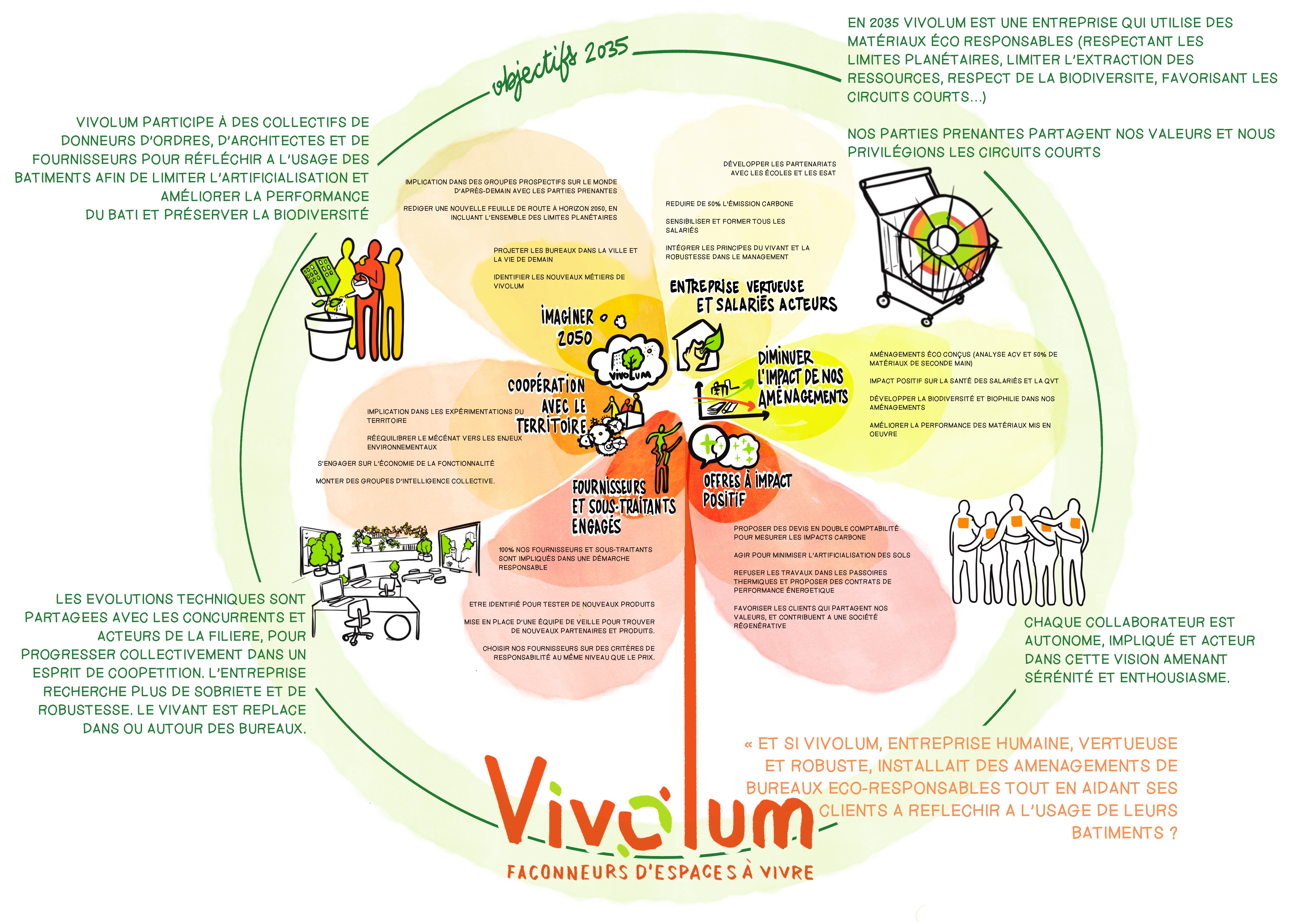 Vivolum s’engage à devenir, d’ici 2035, une entreprise vertueuse et robuste, installant des aménagements de bureaux écoresponsables tout en accompagnant ses clients dans une réflexion sur l’usage et la performance de leurs bâtiments.