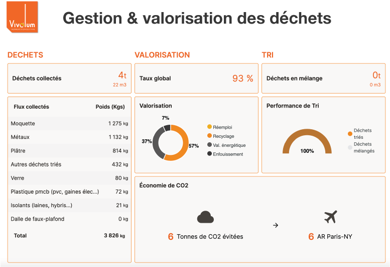 Dans le cadre de la rénovation complète d’un plateau de bureaux confiée à nos équipes, Vivolum est heureux de présenter un bilan particulièrement positif en matière de gestion et de valorisation des déchets.